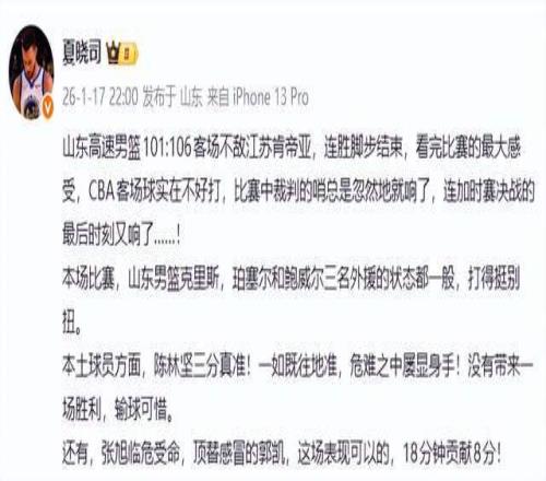 作為山東媒體人,夏曉司老師是會這樣說的,“看完比賽的最大感受,CBA客場球實在不好打,比賽中裁判的哨總是忽然地就響了,連加時賽決戰的最后時刻又響了……”顯然,他覺得是裁判的問題。