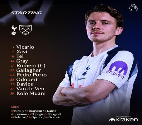 托特納姆熱刺首發:1-維卡里奧、23-波羅、33-本-戴維斯、37-范德芬、17-克里斯蒂安-羅梅羅、14-阿奇-格雷、22-加拉格爾、7-哈維-西蒙斯、11-馬蒂斯-特爾、28-奧多貝爾、39-穆阿尼