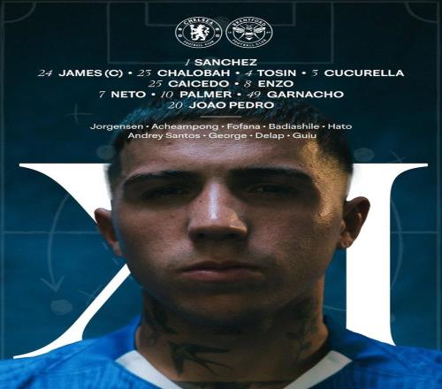 切爾西首發:1-桑切斯、24-里斯-詹姆斯、23-查洛巴、4-阿達拉比奧尤、5-庫庫雷利亞、25-凱塞多、8-恩佐、7-佩德羅-內托、10-帕爾默、49-加納喬、20-若昂-佩德羅