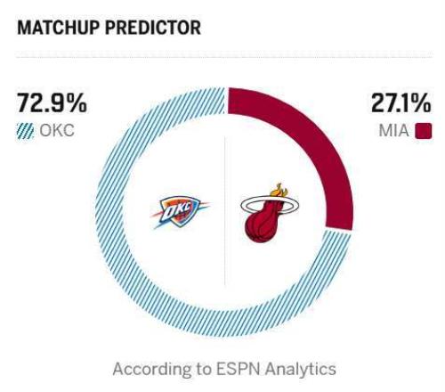 反觀雷霆目前以35勝7負的傲人戰(zhàn)績穩(wěn)居聯(lián)盟榜首,展現(xiàn)出極強的競爭力。在短暫陷入低谷后,雷霆迅速以一波五連勝重振旗鼓,重拾贏球節(jié)奏與賽季初的王者之氣。近3場比賽,雷霆在面對馬刺、火箭等西部勁旅時毫不手軟,不僅悉數(shù)拿下勝利,更在比賽中重現(xiàn)賽季初的統(tǒng)治級表現(xiàn),攻防兩端的壓制力拉滿。這波酣暢淋漓的連勝,不僅穩(wěn)固了自身聯(lián)盟第一的位置,更向全聯(lián)盟彰顯了他們沖擊衛(wèi)冕的堅定決心,狀態(tài)正佳的他們無疑是本賽季奪冠的絕對熱門。值得一提的是,本場熱火與雷霆的比賽,ESPN給出的勝率預測,雷霆高達72.9%,熱火只有27.1%的取勝機會。