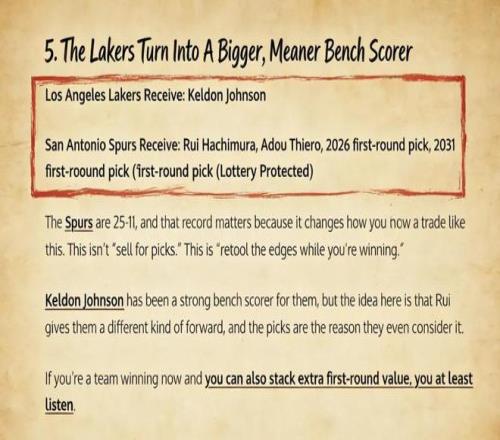 美媒《Fadeaway World》撰文建議,湖人可以將蒂耶羅、八村壘、2026年及2031年首輪簽打包送到馬刺,換回凱爾登。