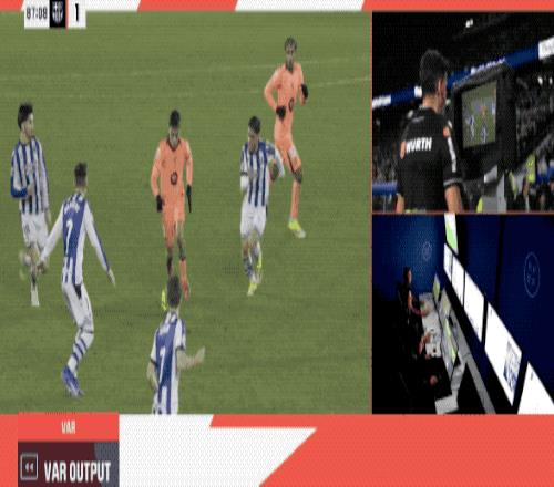久保建英和奧亞薩瓦爾都向裁判投訴,VAR介入,認定奧爾莫犯規在先,進球無效。