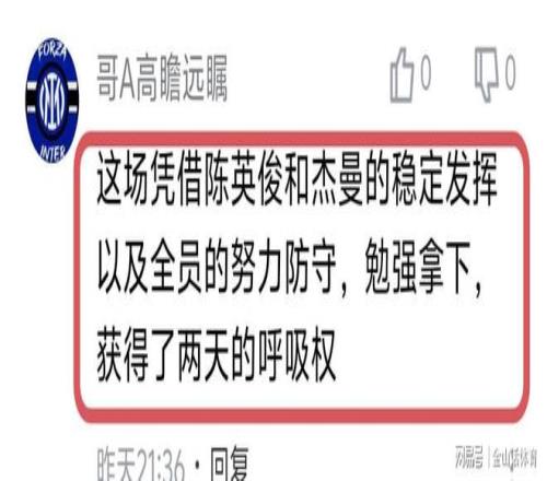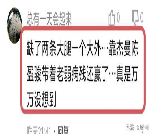 陳盈駿本場的表現,也得到了許多網友的贊揚?!氨本╆爟晌徽娲笸取愑『徒苈??!?;“陳盈駿是北京男籃晴雨表!”;“缺了兩條大腿一個大外…靠杰曼陳盈駿帶著老弱病殘還贏了…真是萬萬沒想到”;“這場憑借陳英俊和杰曼的穩定發揮以及全員的努力防守,勉強拿下,獲得了兩天的呼吸權”……