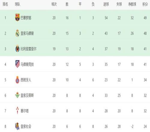 在積分榜上,輸球的巴薩依然排名榜首。巴薩的戰(zhàn)績(jī)是16勝1平3負(fù),拿到49分。皇馬的劣勢(shì)已經(jīng)變得很小了,總積分是48分,只落后巴薩1分排名第2。皇馬最快下一輪有希望超越巴薩登頂,當(dāng)然,前提就是巴薩再次丟分。比利亞雷亞爾拿到41分,排名第3。贏球的馬競(jìng)總積分也是41分,排名第4。西班牙人34分排名第5。