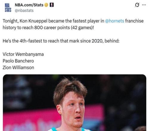 憑借這樣的表現(xiàn),克努佩爾僅花費(fèi)42場(chǎng)比賽就拿到800分,創(chuàng)造黃蜂隊(duì)史最快紀(jì)錄,也是NBA2020年以來(lái)第四快,僅次于文班亞馬、班凱羅與錫安三人。