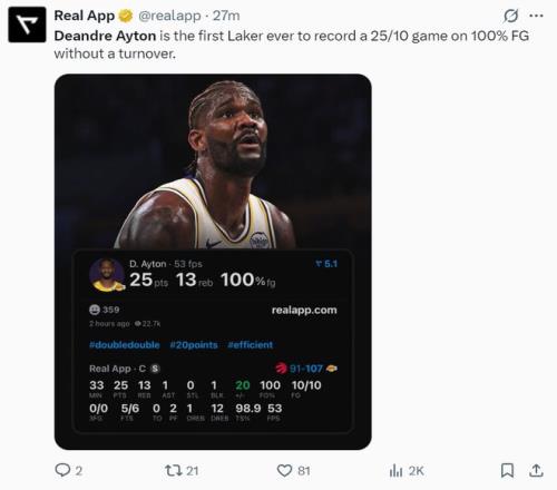 這場比賽后艾頓創造了多項紀錄:1.艾頓成為湖人隊史首位100%+25+10+0失誤的球員;