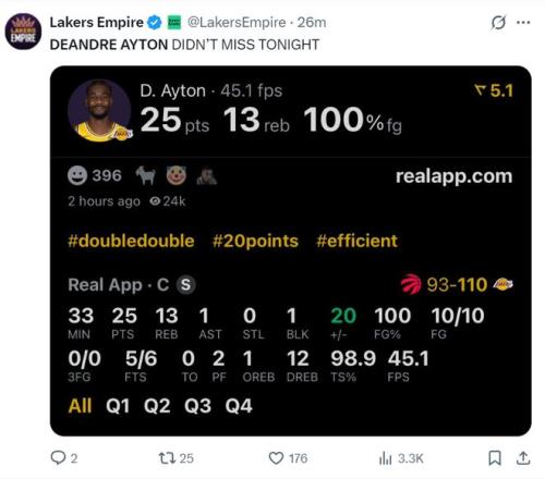 4.艾頓是湖人隊史第三位以100%命中率拿到25+10的球員,比肩張伯倫、奧尼爾;