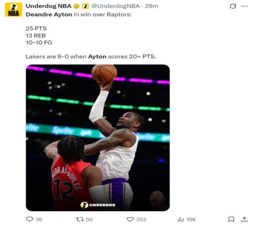 艾頓在這場比賽后,場均29.4分鐘,拿到13.9分8.7籃板0.9助攻0.7搶斷1蓋帽,命中率68%,他的命中率是聯盟第二出色的,他本賽季的薪水只有810萬美元,很多人都說艾頓軟,可他的效率值是真的不差,而且個人效率值非常高,湖人用1610萬就可以使用艾頓兩年真的已經很賺了。