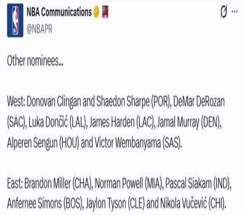 西部:克林根和夏普(開拓者)、德羅贊(國王)、東契奇(湖人)、哈登(快船)、穆雷(掘金)、申京(火箭)、文班亞馬(馬刺)