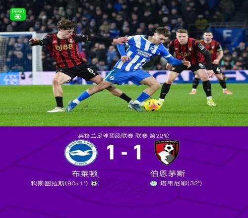 北京時間1月20日英格蘭足球頂級聯賽 聯賽 第22輪,布萊頓主場對陣伯恩茅斯。上半場,阿德利造點,塔韋尼耶主罰命中。下半場最后時刻,范黑克助攻,科斯圖拉斯倒鉤絕平。全場比賽結束,布萊頓1-1伯恩茅斯。