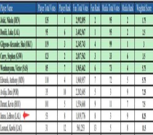 詹姆斯最終的球迷票數是1819776票,在西部排名第8,他的媒體票得到3張,在西部排名第9,他的球員票得到53張,在西部排名第8。他的加權積分是8.25,總票數排名西部第9,落后于約基奇、東契奇、亞歷山大、庫里、文班亞馬、愛德華茲、阿夫迪亞、杜蘭特。