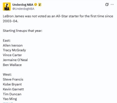詹姆斯的新秀賽季效力于克利夫蘭騎士隊,彼時的東部全明星首發陣容由艾弗森、麥迪、卡特、本-華萊士與杰梅因-奧尼爾構成。西部全明星首發陣容為弗朗西斯、科比、加內特、蒂鄧肯以及姚明,這份名單堪稱星光熠熠。