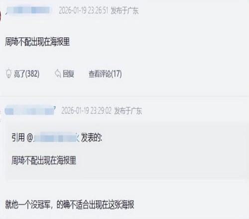 有廣東球迷直接表示:周琦不配出現在海報里;評論區下方還有球迷回復了幾條扎心的評論:就他一個沒有冠軍,的確不適合出現在這張海報。他也就在一個賽季他就打了 28 場,確實沒什么關系。