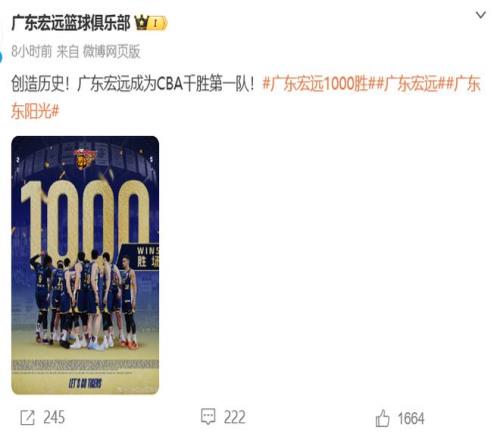 面對CBA本賽季戰績最差的副班長四川男籃,廣東隊這次沒有手軟,在輪休了薩姆納和杜潤旺的情況下,依靠三大主力胡明軒、奎因、薩林杰合力砍下的80分,客場以104-76大勝四川,結束2連敗的同時,球隊也收獲了一場極具里程碑意義的勝利,拿到了俱樂部成立以來的第1000場勝利,也是CBA歷史上第一支達到此成就的球隊,賽后,廣東隊官方曬出了慶祝海報。