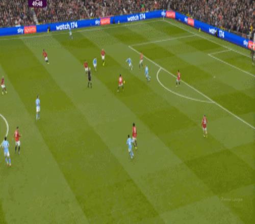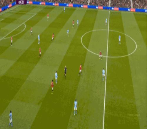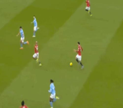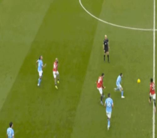 然而可惜的一點是,曼聯(lián)的開分球并未發(fā)生在常規(guī)的反擊戰(zhàn)環(huán)節(jié),而是發(fā)生在任意球防守之后的反擊戰(zhàn)環(huán)境里,所以曼城的后場建制更不完整,后衛(wèi)只有胡桑諾夫一人,甚至還因為布魯諾的帶球,出現(xiàn)了這樣明顯的腳步上的失誤: