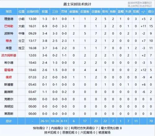 巴特勒15分1板3助2斷、庫里11分1板7助、穆迪10分2板1助2斷、波斯特9分7板2助、波杰姆斯基7分2板2助、霍福德5分4板1助、希爾德5分2板、佩頓4分2板、理查德2分2板5助2斷、戴維斯2分、斯潘塞1助