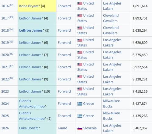 新的時代,東契奇生涯首奪全明星票王,此前10年詹姆斯7次奪魁 懂球帝 2026-01-21 01:16:36 北京時間今日,NBA官方公布了本賽季全明星首發票選結果,湖人球星盧卡-東契奇榮膺票王。據統計,這是東契奇自2018年進入NBA以來生涯首次當選全明星票王。本賽季至今,東契奇場均出場36.3分鐘,能夠得到33.3分7.5籃板8.6助攻1.6搶斷0.6蓋帽,投籃命中率46.4%,三分命中率33.7%。值得一提的是,在此前10年的全明星票選中,東契奇的隊友詹姆斯7次奪得票王,此外字母哥2次奪魁,科比則在退役賽季奪得票王。NBA免費觀看_科比免費觀看_全明星免費觀看_NBA高清在線_科比高清在線_全明星高清在線 NBA 科比 全明星 湖人球員 阿德托昆博 勒布朗詹姆斯 盧卡·東契奇 勒布朗·詹姆斯 上一篇: 勇士的最后機會提前結束,原本只缺少合格的第三替補現在副手卻受傷_NBA直播 下一篇: 多年廢材!決定湖人上限!一戰問鼎第一人!