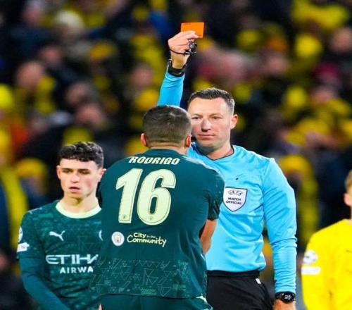 然而第62分鐘,羅德里戰(zhàn)術(shù)犯規(guī)拉拽對(duì)手,短時(shí)間連吃兩張黃牌,堂堂金球先生被罰下,曼城剩下10人作戰(zhàn)。