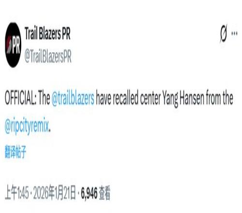 北京時間1月21日,開拓者官方宣布從混音隊召回楊瀚森。另外,有媒體統計了開拓者隊內所有球員的全明星球迷得票,楊瀚森排名第三。