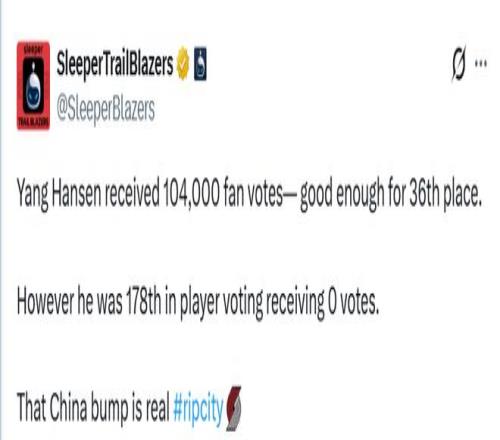媒體SleeperTrailBlazers寫道:“楊瀚森收獲104000張球迷選票,排名第36位。然而在球員投票環節,他一票未得,位列第178名。中國人氣效應果然名不虛傳?!?/p>