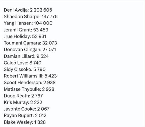 有媒體統計了開拓者球員在球迷投票環節的得票情況。阿夫迪亞2202605票斷層領先全隊,開拓者得票第二多的球員是謝登-夏普,他得到147776票,而楊瀚森得到104000票,位居第三。格蘭特和霍勒迪分列第四和第五。以下是所有人的具體票數——
