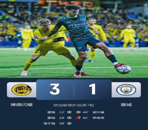 北京時間1月21日1:45,歐冠聯(lián)賽小組階段第7輪開打,英超豪門曼城客場對陣博德閃耀。此役哈蘭德延續(xù)低迷表現(xiàn),羅德里吃到紅牌,博德閃耀球員卡斯帕-霍兩分鐘兩球,海于格打進(jìn)世界波,曼城1-3客場爆冷,遭遇各項賽事兩連敗。