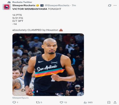 北京時(shí)間1月21日,馬刺以106-111被火箭逆轉(zhuǎn)結(jié)束三連勝。這場(chǎng)比賽馬刺一度領(lǐng)先火箭16分,他們前三節(jié)的三分投得很好,可末節(jié)火箭提升防守后馬刺三分連連打鐵,最關(guān)鍵的兩個(gè)三分球文班亞馬都未能命中,下半場(chǎng)文班亞馬11中1拉胯無比(還有一個(gè)補(bǔ)扣是垃圾時(shí)間刷分)。
