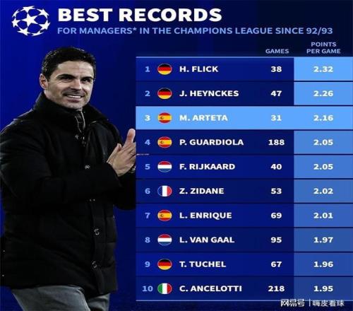 根據(jù)《德國轉(zhuǎn)會市場》的統(tǒng)計,執(zhí)教歐冠場次超過25場的主帥當(dāng)中,阿爾特塔31場得到67分,場均得分2.16分,排在第三名,比曼城主帥瓜迪奧拉還要高一點。對于一名執(zhí)教經(jīng)歷不長的主教練來說,真的很不容易。
