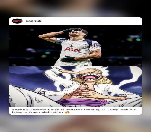 在解釋這個(gè)慶祝動(dòng)作時(shí),索蘭克表示:“是這樣的,我們家又要迎來(lái)一個(gè)新成員了,我的妻子正在懷孕。所以這個(gè)進(jìn)球我想獻(xiàn)給她。我加入了一個(gè)小小的動(dòng)漫慶祝。我知道很多人都在等待我復(fù)出后的第一個(gè)進(jìn)球,那個(gè)動(dòng)作來(lái)自《海賊王》,這是我最喜歡的動(dòng)漫之一,是路飛的一個(gè)動(dòng)作。”同時(shí)索蘭克在快拍中將路飛P上了熱刺的球衣。