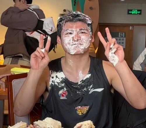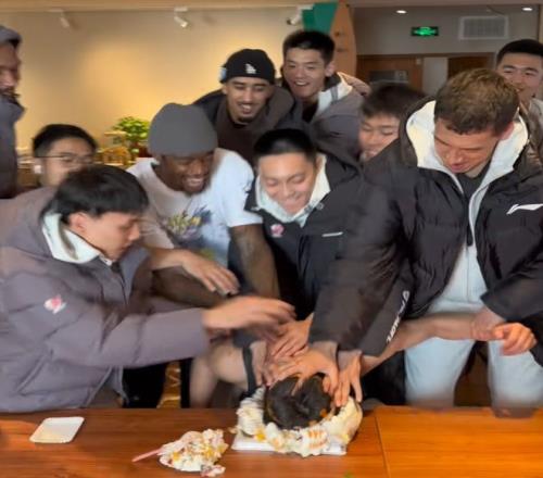 準備工作做完后,主力的人員還是胡明軒、徐杰、薩姆納和杜潤旺,他們狠狠將陳家政摁在蛋糕上。這個時候徐杰慢了一點,他當時還在品嘗蛋糕呢,隊友就下手了,最后才匆匆上手。