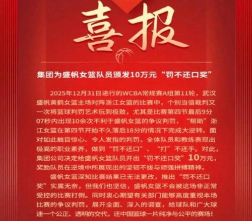 2025年12月31日WCBA第11輪,武漢盛帆女籃遭遇爭(zhēng)議判罰,導(dǎo)致輸給浙江女籃。賽后,武漢盛帆女籃因球員和教練在爭(zhēng)議判罰中保持"罰不還口""打不還手"的職業(yè)素養(yǎng),特獎(jiǎng)勵(lì)全隊(duì)10萬元。此舉旨在肯定球員精神,同時(shí)表達(dá)對(duì)裁判工作的強(qiáng)烈不滿。