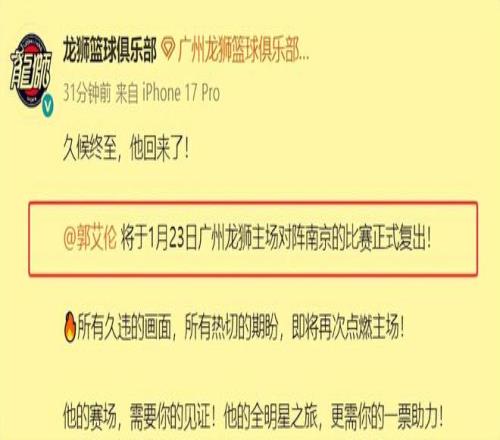 北京時(shí)間1月21日下午3點(diǎn)56,廣州隊(duì)正式官宣,郭艾倫將于1月23日主場(chǎng)對(duì)陣南京同曦隊(duì)的比賽復(fù)出,看來(lái)他的傷病已經(jīng)痊愈了。