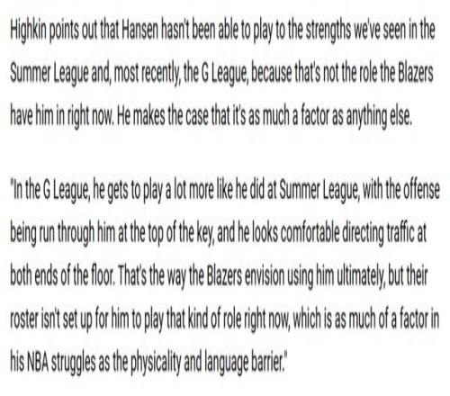 “在發展聯盟的賽場,他的打法更貼近夏聯的狀態:進攻端由他在罰球線頂端發起,無論攻防兩端,他指揮球隊進攻的表現都顯得游刃有余。這也是開拓者最終想要打造的他的比賽方式,但球隊目前的陣容配置,還無法讓他承擔這樣的角色——這一點,與身體對抗強度、語言障礙一樣,都是他在NBA賽場掙扎的關鍵原因。”