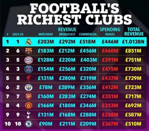 而且,因為英超和歐洲其他豪門的收入增長迅猛,曾10次排名收入榜首的曼聯只能下滑,在德勤排行榜創立29年來首次無緣前五。本賽季,曼聯不僅無緣歐冠,而且國內兩項杯賽均「一輪游」,這賽季只有20個主場比賽,收入可能因此減少8500萬英鎊!