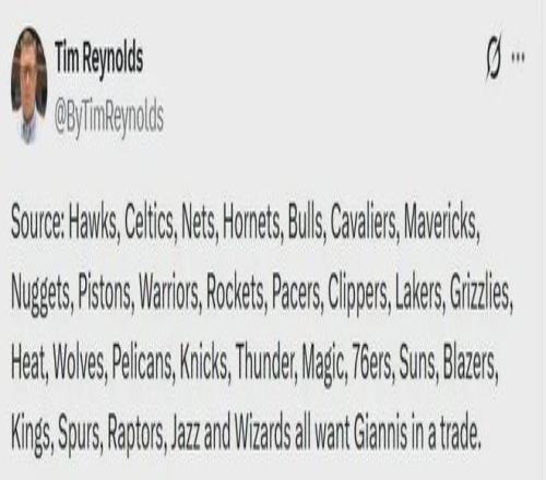 隨著字母哥炮轟隊友一事發生,關于他的交易傳聞再度不絕于耳,美聯社知名記者Tim Reynolds對此表示其余29支球隊都有意將其收入麾下。