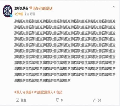 戰(zhàn)勝湖人笑傲洛杉磯德比,快船官媒賽后連發(fā)190個“贏啦” 懂球帝 2026-01-23 17:17:44 北京時間1月23日,NBA常規(guī)賽迎來洛杉磯德比戰(zhàn)。最終,快船主場112-104戰(zhàn)勝湖人,繼續(xù)排在西部第10。賽后,快船官方媒體在社媒上連發(fā)190個“贏啦”慶祝勝利。NBA免費觀看_德比免費觀看_快船隊免費觀看_NBA高清在線_德比高清在線_快船隊高清在線 NBA 德比 快船隊 洛杉磯 湖人球員 NBA常規(guī)賽 快船戰(zhàn)勝湖人 上一篇: 烏度卡真是不粘鍋!發(fā)布會全程甩鍋,火記一針見血直指用人問題! 下一篇: 不會進攻的優(yōu)質戰(zhàn)力!新一代奇人