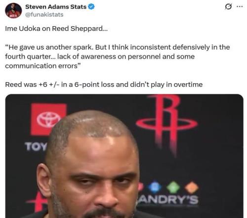 火箭媒體人Will更是發文直接點名烏度卡,表示自己真得需要烏度卡解釋一下,為什么謝潑德登場機會這么少,而且每一次都是在其狀態火熱時發生,火箭隊本賽季差不多有8-10場被逆轉的比賽是從謝潑德使用出問題開始的。
