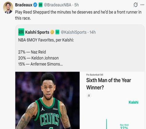 隨后Bradeaux又迅速轉發NBA本賽季超級第六人預測數據,其中謝潑德以9%概率排在第6,不及雷霆阿杰伊-米切爾(10%)、熱火小海梅(13%)、凱爾特人安芬尼西蒙斯(15%)、馬刺凱爾登約翰遜(20%)和森林狼納茲里德(27%)。