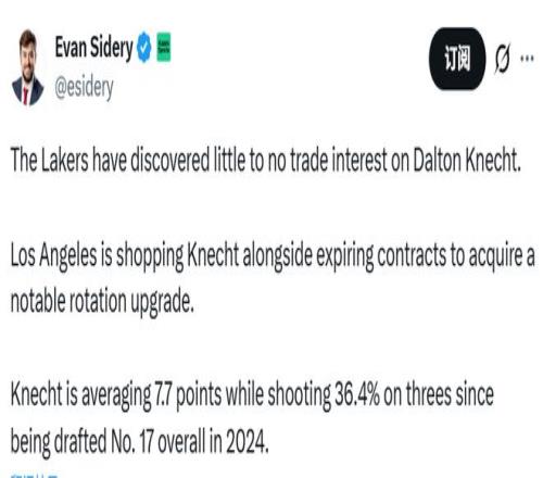 另外,Sidery還報道稱,湖人隊發現聯盟各隊對于克內克特的交易意愿幾乎為零。湖人方面曾計劃將克內克特與到期合同打包交易,以求換來一名能顯著提升球隊輪換實力的球員。