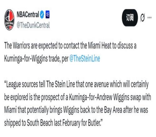 北京時(shí)間1月24日,在吉米-巴特勒遭遇賽季報(bào)銷的前交叉韌帶撕裂傷病后,金州勇士隊(duì)針對(duì)交易截止日的運(yùn)作思路已經(jīng)浮出水面。名記Stein報(bào)道,勇士隊(duì)有意探討將前鋒喬納森-庫(kù)明加交易至邁阿密熱火隊(duì),從而換回安德魯-維金斯的可能性。