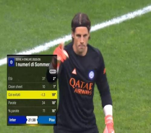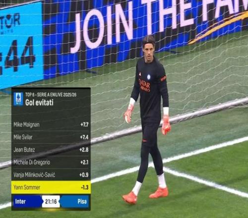 事實上賽前轉播商DAZN還公布了一組本賽季意甲門將阻止對手預期進球的數據,其中米蘭隊長邁尼昂以7.7球高居榜首,羅馬門將斯維拉爾則是7.4球位居第二。而索默在這項數據上卻是尷尬的-1.3,這意味著他甚至還讓對手進了更多的球。