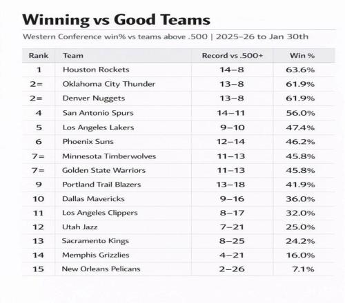 根據數據統計顯示,火箭隊開賽至今面對勝率超過50%的強隊時,戰績為14勝8負,勝率高達63.6%,力壓雷霆與掘金高居西部第一。