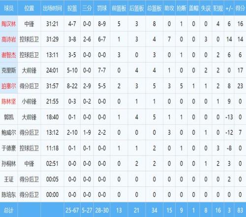 本場比賽,山東隊共4人分上雙,珀塞爾23分5籃板3助攻5搶斷,陶漢林16分8籃板,克里斯17分4籃板,高詩巖14分4籃板7助攻。近期表現不俗的小將王證僅獲得5秒上場時間。此外,兩名小外援本場手感冰冷,合計32投10中,砸歪籃筐。