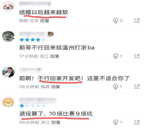 本場比賽浙江蘭道夫、約克兩名小外狀態一般,程帥澎更是投出10中0的命中率,吳前也沒有挺身而出,手感也被傳染,在打了18分鐘的情況下,三分球3中0,只靠罰球得到3分,正負值-10。有球迷直接吐槽吳前:結婚以后越來越軟。