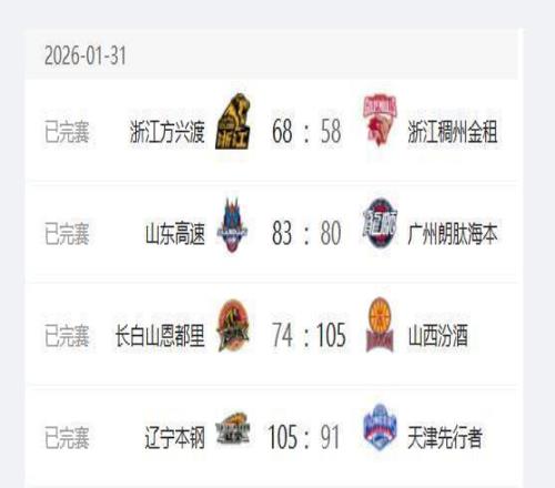 CBA常規賽,1月31日晚上共有4場比賽,其中浙江廣廈隊主場以68-58戰勝浙江稠州隊,山東高速男籃主場以83-80戰勝廣州龍獅隊,遼寧隊在主場以105-91戰勝天津隊,吉林隊主場74-105不敵山西隊。這4場比賽過后山東高速男籃的排名進入前4,遼寧隊重回前10,排名前三的球隊還是浙江廣廈隊、上海隊和廣東隊。