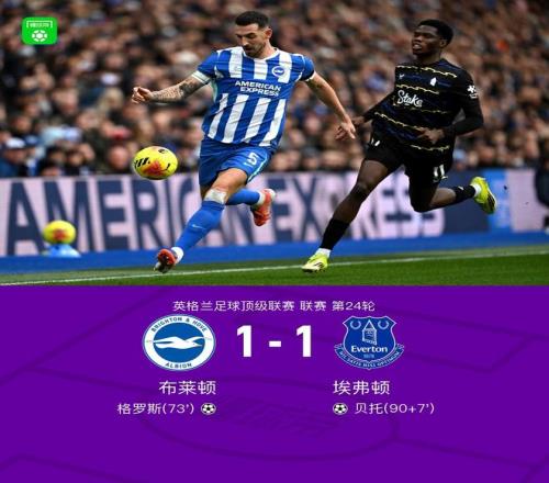 北京時間1月31日英格蘭足球頂級聯(lián)賽 聯(lián)賽 第24輪,布萊頓主場對陣埃弗頓。布萊頓格羅斯破門。埃弗頓貝托破門。最終比分布萊頓 1-1 埃弗頓。
