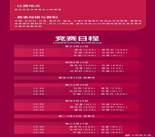 中國(guó)女籃將坐鎮(zhèn)主場(chǎng)在武漢參加世預(yù)賽,如今武漢賽區(qū)公布具體競(jìng)賽日程。中國(guó)女籃將從3月11日到17日,7天之內(nèi)先后對(duì)陣馬里女籃、比利時(shí)女籃、南蘇丹女籃、捷克女籃和巴西女籃。