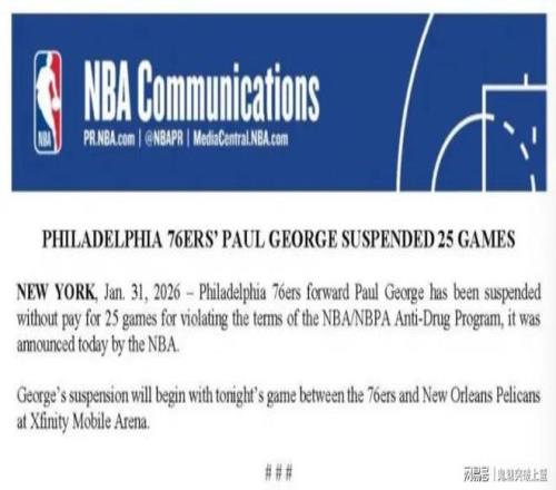 北京時間2月1報道,NBA官方宣布,費城76人前鋒保羅-喬治因違反聯盟禁藥政策,他將被禁賽25場。