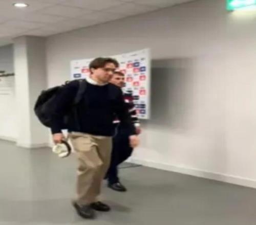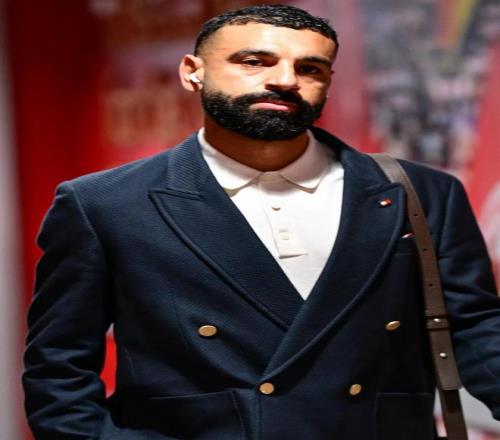 薩拉赫穿著一套西裝、搭配流蘇鞋走過通道時,神情顯得有些低落。