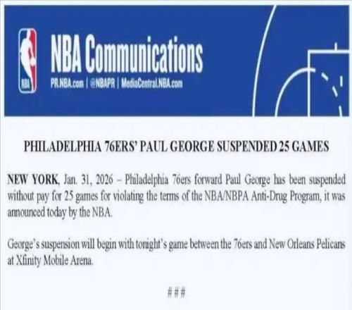 然而,就在今天,76人收到了聯盟的一紙罰單,瞬間將所有期待粉碎。NBA官方發布重磅處罰:費城76人隊前鋒保羅·喬治因違反聯盟反興奮劑條例被禁賽25場!